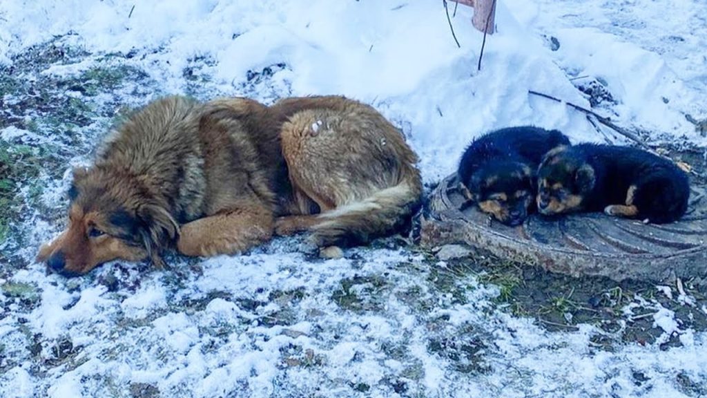 On a freezing winter morning, a kind stranger stumbled upon a heartbreaking sight—a stray mother dog curled tightly around her two tiny puppies in the snow. The cold was merciless, the air sharp enough to sting the skin, and yet this little family had no shelter, no warmth, and no one to turn to. The mother’s fur was matted with frost, her body trembling as she tried to shield her puppies from the biting wind. People passed by, glancing for a moment before moving on, unaware that life itself was fading right there in front of them.
