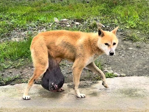 In a quiet mountain valley, where the morning mist lingers over the pine trees and time seems to move a little slower, a suffering dog struggled to survive. Her body was frail, her ribs visible beneath thinning fur, and her belly was weighed down by a large, painful swelling that made each step difficult. She moved slowly, her eyes heavy with exhaustion and quiet sorrow, as if carrying not only the burden of her illness but also the weight of her fading hope. When people tried to reach out to her, she turned away gently, not in anger but in fear and weariness, longing for peace from her pain.