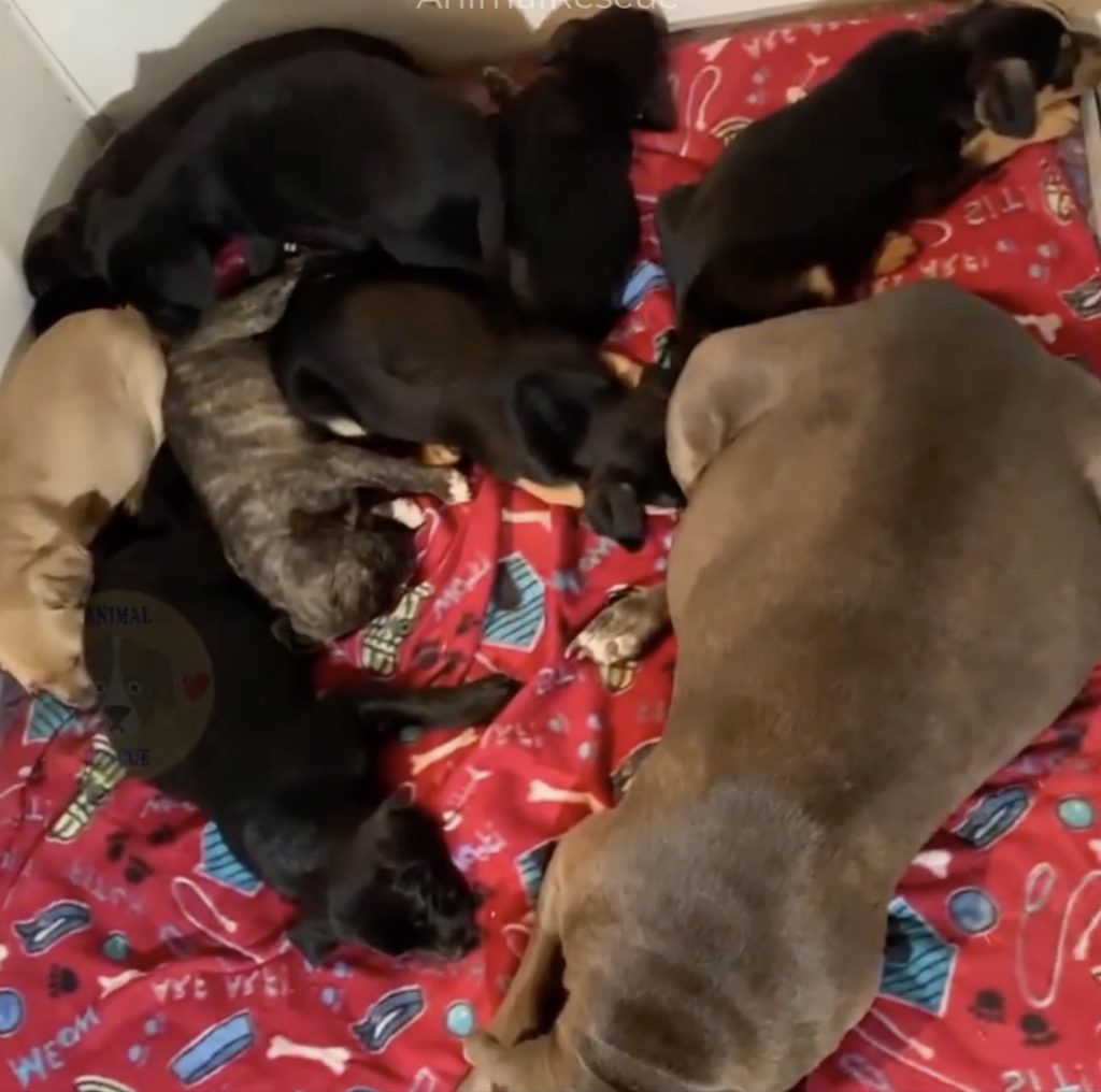 Raising that many puppies is no easy task, especially for a mother already worn thin by her past. Rosemary did her best—nursing, cleaning, guarding—but even the strongest need a break. Recognizing this, the rescue team stepped in. Volunteers bottle-fed the pups around the clock, taking shifts to ensure every little one was nourished and safe. It became a true team effort, a circle of care fueled by love, patience, and the determination to give these pups a fighting chance.