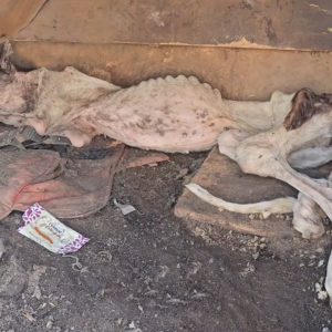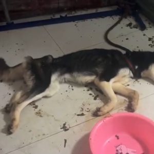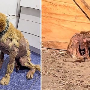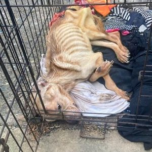 It all began on a quiet morning when rescuers stumbled upon a small wire crate left behind after an eviction. Inside was a frail, motionless dog—skin and bones, her body trembling from exhaustion…
